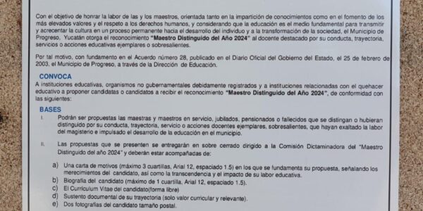 Progreso, Yucatán a 08 de abril de 2024. El Ayuntamiento de Progreso, a través de la Dirección de Educación, reitera a las instituciones vinculadas a la educación a proponer como candidatos a aquellos docentes de instituciones educativas públicas o privadas…