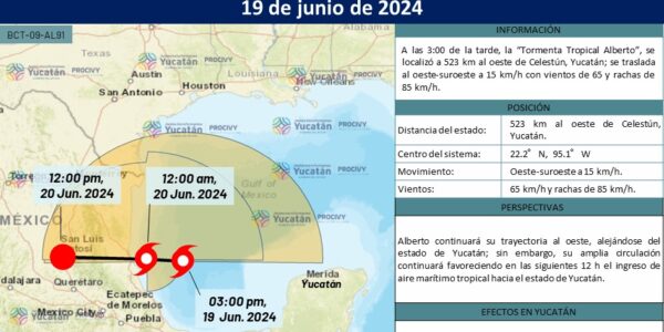 Mérida, 19 de junio de 2024.- La Tormenta Tropical “Alberto” se encuentra afectando a Veracruz y Tamaulipas, ya muy lejos de Yucatán, por lo que no representa riesgo directo. Sin embargo, continuarán las lluvias para este fin de semana por…