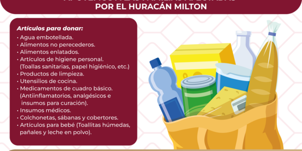 • Del 9 al 16 de octubre, se estarán recibiendo donativos en el Centro de Acopio en el edificio central del Sistema DIF Yucatán. • Se estarán recibiendo donativos en especie como agua purificada, alimentos no perecederos, artículos de higiene personal, productos…