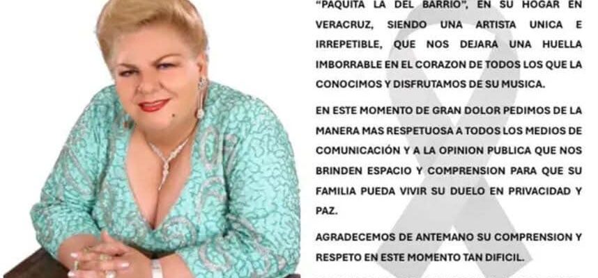 A los 78 años de edad, Francisca Viveros Barradas, conocida como Paquita la del barrio oficial “” falleció esta mañana, alrededor de las 8 am, a los 77 años de edad,en su natal Veracruz informó la familia en un comunicado….