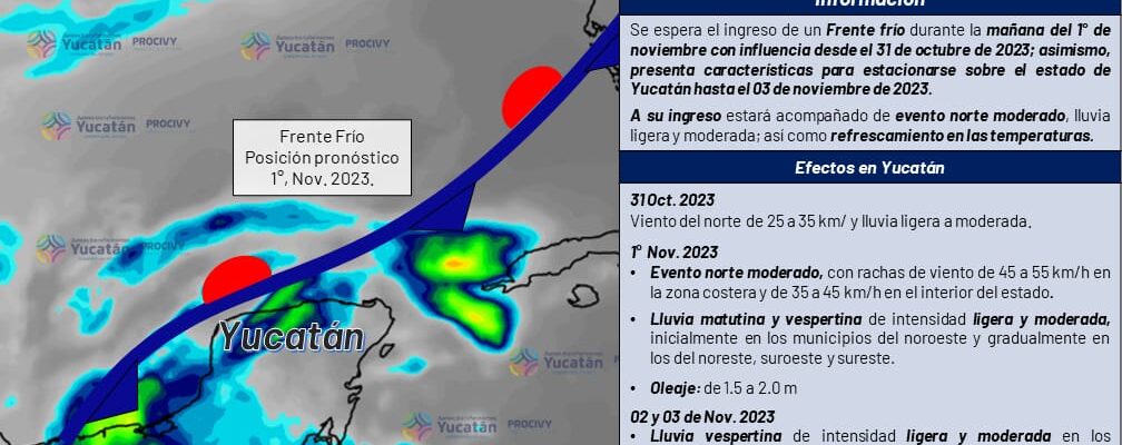Mérida, 27 de octubre de 2023.- Con influencia desde el próximo 31 de octubre se espera el ingreso de un frente frío en la mañana del uno de noviembre con características para estacionarse sobre el Estado de Yucatán hasta el…